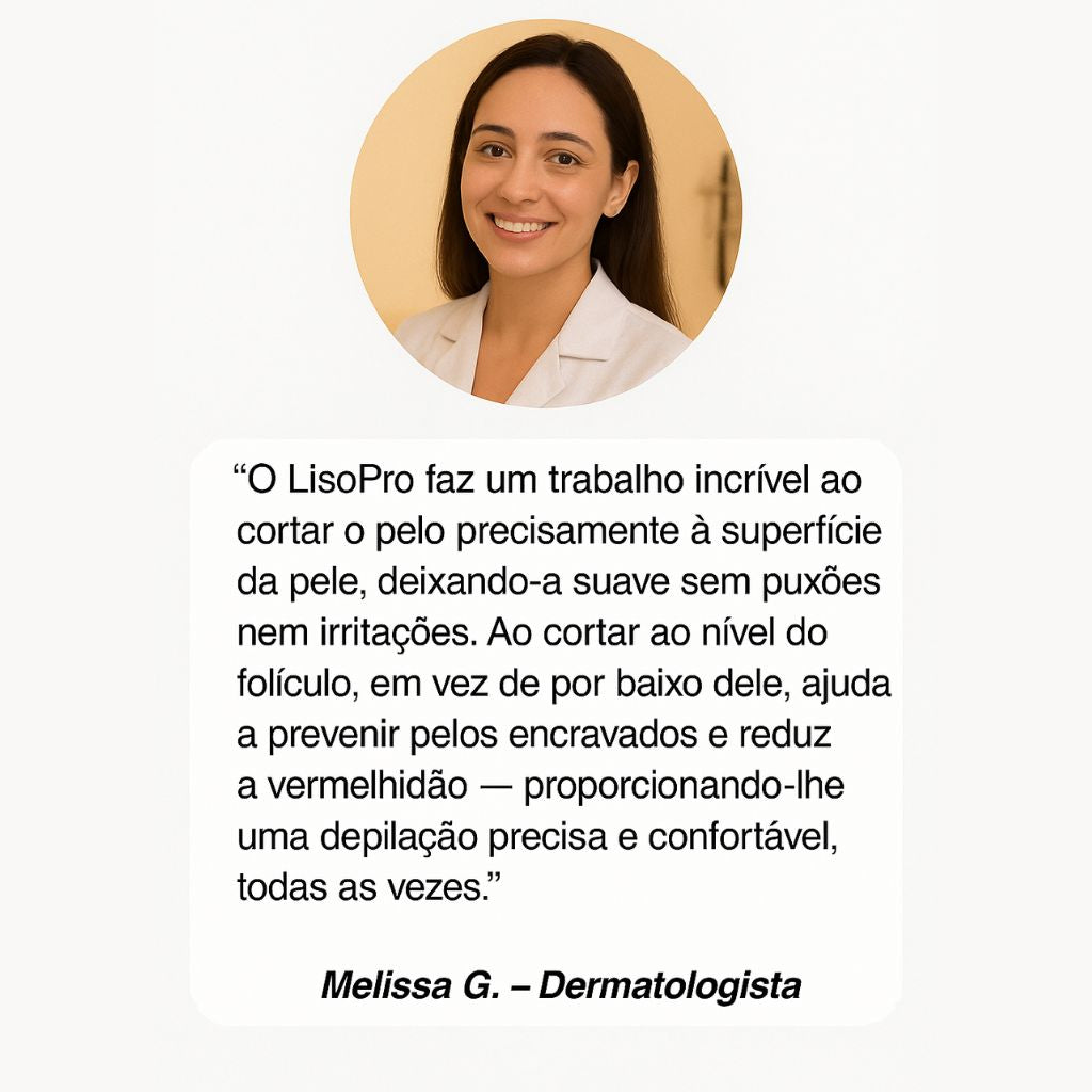 Desenvolvido com esteticistas diplomadas, o LisoPro™ usa tecnologia avançada para um barbear rente e confortável — sem cortes, borbulhas ou irritações.